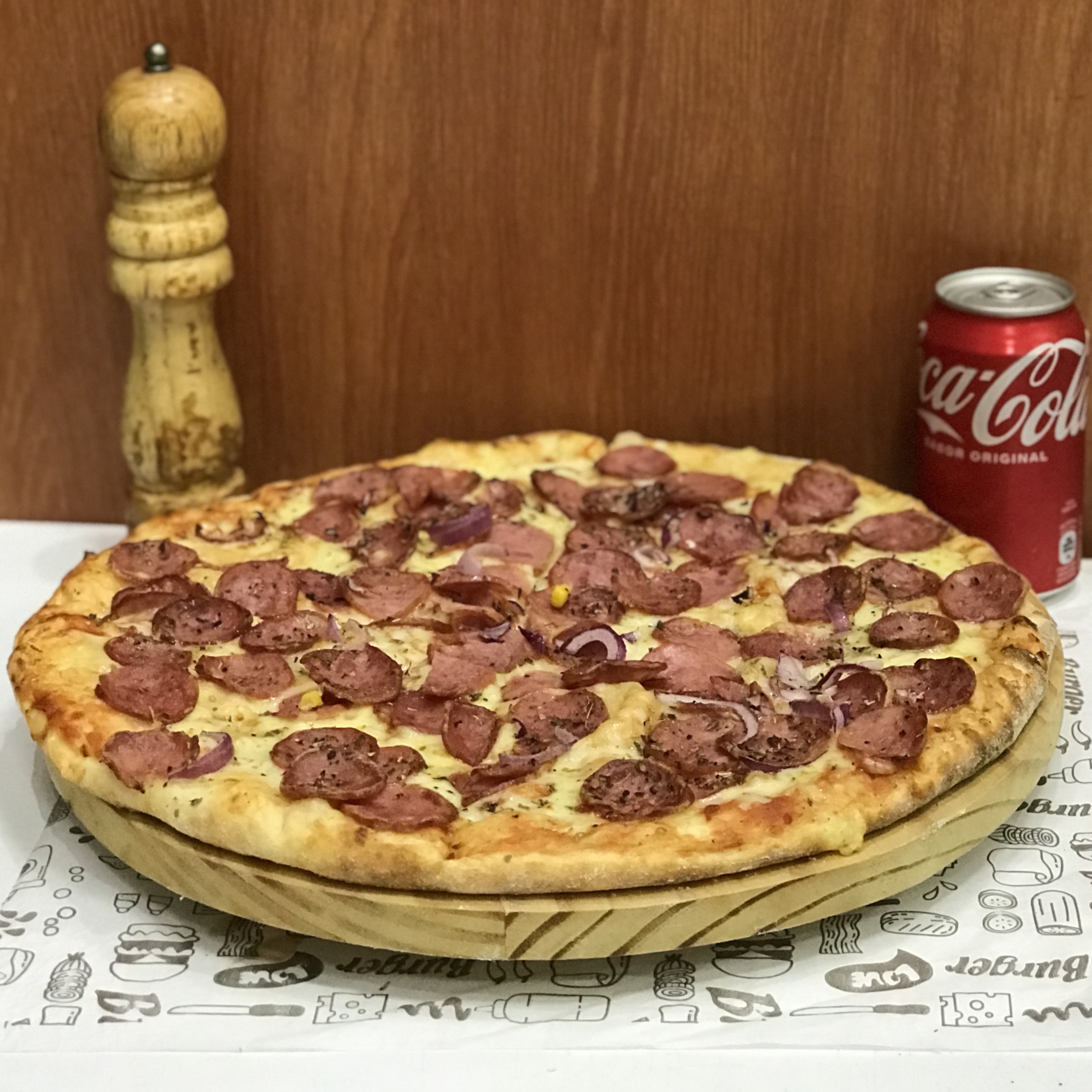 BLEND DE CARNE SELECIONADA, MOLHO RK, PRESUNTO, BATATA PALHA, CALABRESA, OVO,MUSSARELA, VERDURAS